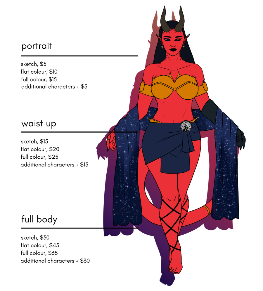 ➤ Reach out to me on Instagram, Discord, or via email. If you're emailing me, please ensure you include something in the subject line so I know it's not spam.➤ Please let me know what style you'd like for your commission: sketch, flat colour, or full colour, as well as either portrait, waist up, or full body.➤ If you have character references, please send those to me as well. If you don't, I will accept references as long as they're relatively clear. I will also accept clear descriptions written out.➤ If you have specifics (accessories, pose, expressions, etc), please let me know. If you prefer giving me creative freedom, I can work with that as well.